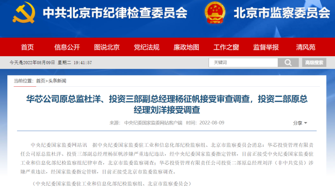 8月9日,据中央纪委国家监委驻工业和信息化部纪检监察组、北京市监察委员会消息,华芯投资管理有限责任公司(下称“华芯投资”)原总监杜洋、投资三部副总经理杨征帆涉嫌严重违纪违法,经中央纪委国家监委指定管辖,目前正接受中央纪委国家监委驻工业和信息化部纪检监察组纪律审查,北京市监委监察调查;华芯投资管理有限责任公司投资二部原总经理刘洋(非中共党员)涉嫌严重违法,经国家监委指定管辖,目前正接受北京市监委监察调查。