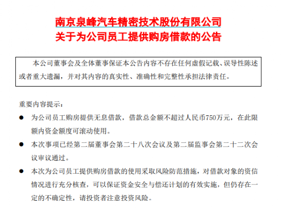 8月10日,泉峰汽车发布关于为公司员工提供购房借款公告,称拟使用不超过人民币750万元的自有资金向员工提供无息借款。
