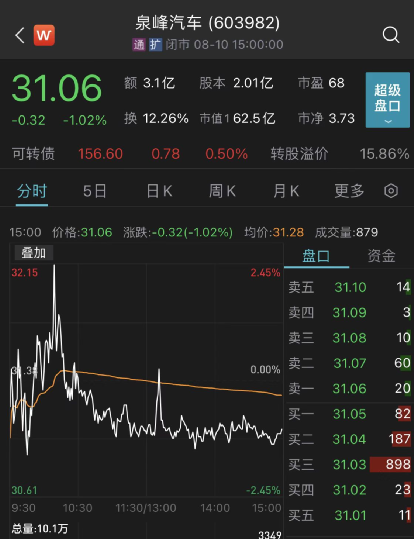 截至8月10日收盘,泉峰汽车每股报31.06元,近3个交易日内涨幅超11%。最新市值为62.5亿元。