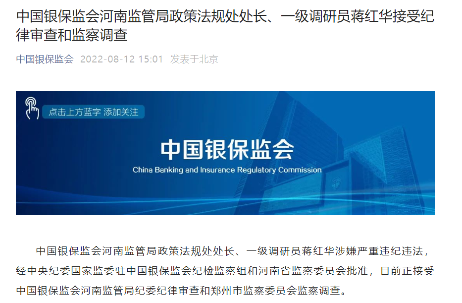 中国银保监会河南监管局政策法规处处长、一级调研员蒋红华涉嫌严重违纪违法,经中央纪委国家监委驻中国银保监会纪检监察组和河南省监察委员会批准,目前正接受中国银保监会河南监管局纪委纪律审查和郑州市监察委员会监察调查。