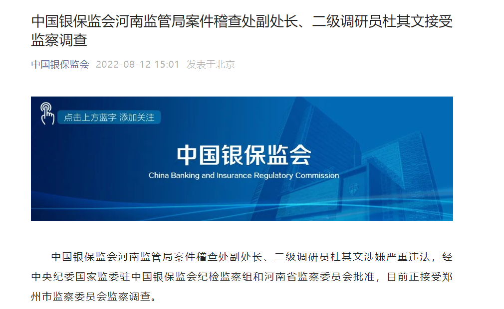 同日落马的河南银保监系统内官员还有银保监会河南监管局案件稽查处副处长、二级调研员杜其文,通报显示,杜其文涉嫌严重违法,经中央纪委国家监委驻中国银保监会纪检监察组和河南省监察委员会批准,目前正接受郑州市监察委员会监察调查。