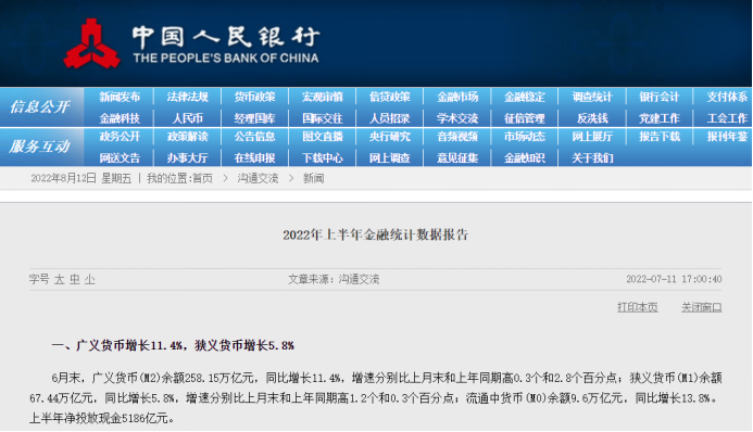 8月12日,人民银行发布2022年7月金融统计数据报告。数据显示,7月份人民币贷款增加6790亿元,同比少增4042亿元。7月社会融资规模增量为7561亿元,比上年同期少3191亿元。总体来看,7月份新增信贷、社融规模增量数据不及市场预期。