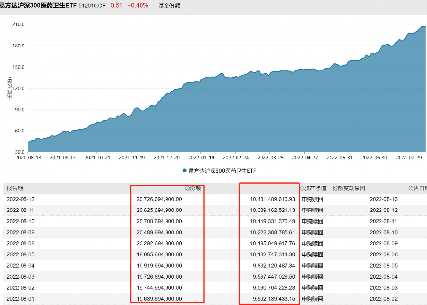 具体来看,易方达沪深300医药卫生ETF年内基金份额增加88.38亿份,至207.27亿份,最新净值规模为104.81亿元。8月以来该ETF基金份额增加超10亿份,仅过去一周便增加7.41亿份。值得一提的是,该ETF无论基金份额还是净值规模均创出历史新高,其中净值规模更于8月成功晋级“百亿俱乐部”。