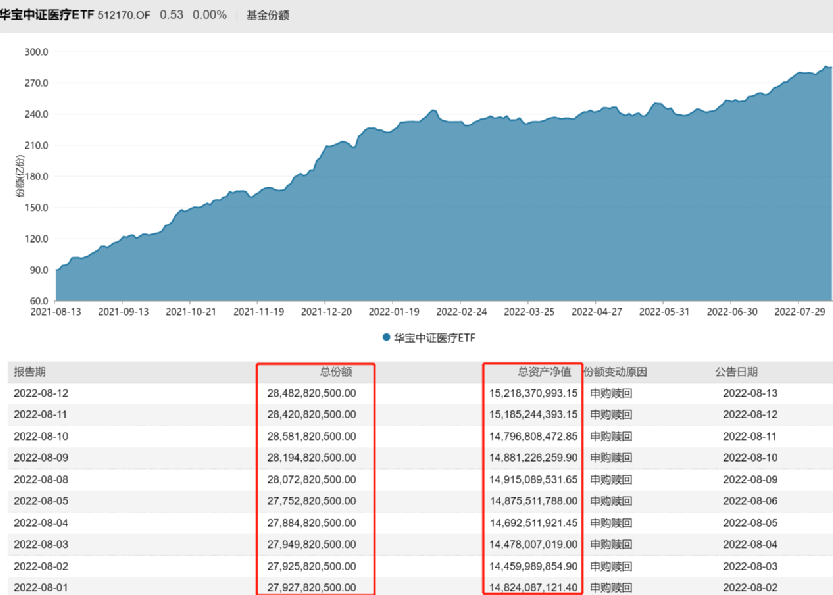 华宝中证医疗ETF年内份额增加76.88亿份,至284.83亿份,最新净值规模为152.18亿元。其中,仅过去一周份额便增加7.3亿份,最新基金份额和净值规模同样创出历史新高。