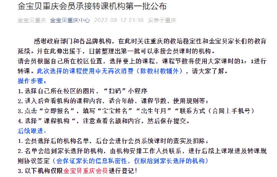 随后在8月12日,金宝贝重庆公布了会员承接转课机构第一批机构,同时附上了相关操作步骤。
