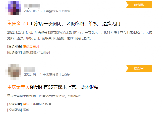 不过据家长反映,在重庆金宝贝倒闭后,维权、退款无门。黑猫投诉平台中,已有多个关于“重庆金宝贝”的投诉情况。