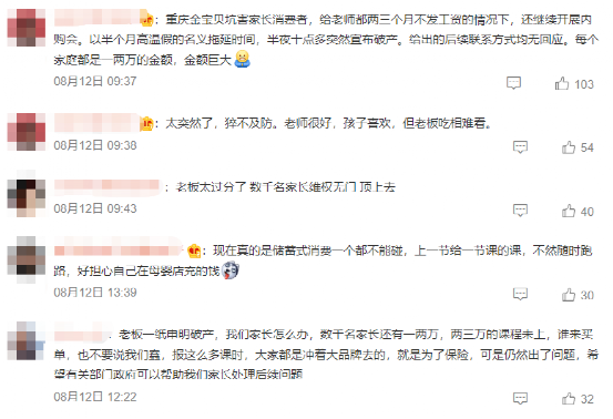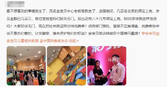 另外,也有家长留言称,“重庆金宝贝坑害家长消费者,给老师两三个月不发工资的情况下,还继续开展内购会。以半个月高温假的名义拖延时间,半夜十点多突然宣布破产。给出的后续联系方式均无回应。每个家庭都是一两万的金额,金额巨大。”