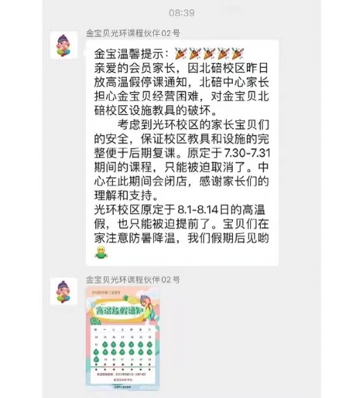 据了解,在七月份重庆金宝贝各校区曾发布高温放假通知,当时便有不少家长怀疑其中有蹊跷,担心该机构要“跑路”。