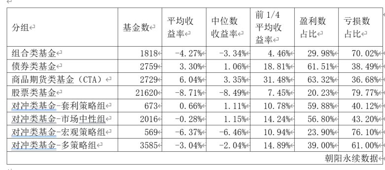 私募排排网数据则显示,成立满7个月且近期有业绩更新的18943只私募证券投资基金在今年以来的平均收益率为-4.46%,其中有6422只基金取得了年内正收益,占比为33.90%。分策略来看,债券策略以9.95%的平均收益率领先,期货及衍生品策略(CTA)今年来以8.58%的平均收益紧随其后。而股票策略、多资产策略及组合基金在今年以来的平均收益率分别为-8.34%、-1.42%及-3.59%。朝阳永续基金研究院数据显示,今年前7个月股票类私募基金平均下跌8.71%,宏观策略跌6.37%,而商品期货类(CTA)、债券类基金分别上涨6.04%、3.3%。