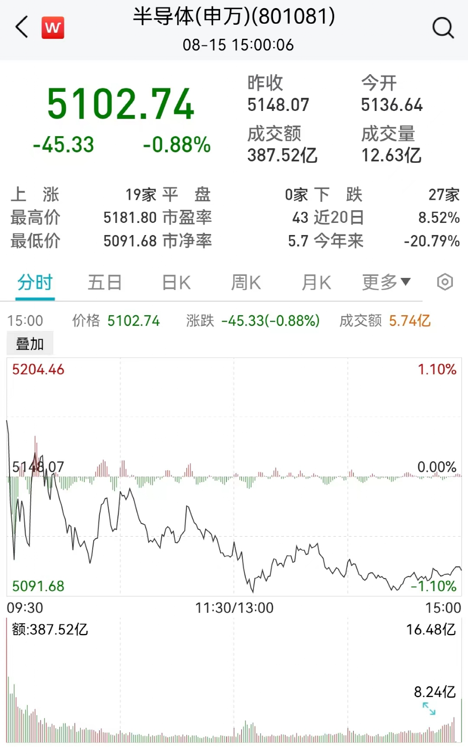 值得注意的是,申万半导体指数从今年4月最低点3792点以来一直延续反弹态势,截至8月15日收盘已经累计反弹超30%。今日,申万半导体指数微跌0.88%。46只成分股中,19只个股涨,27只个股跌。