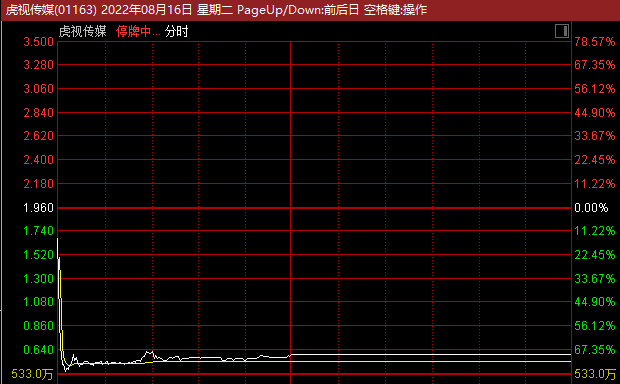 8月16日早间开盘后,虎视传媒股价随即闪崩,最大跌幅达到74%,此后至中午收盘,跌幅为69.9%,报0.59港元/股。