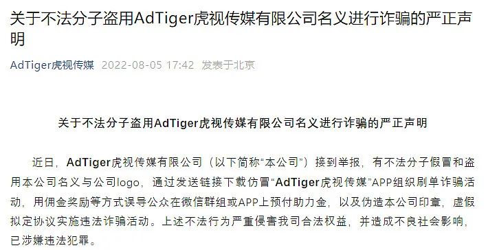 而消息面上,虎视传媒此前称接到举报,有不法分子假冒和盗用公司名义,并伪造公司印章进行违法诈骗活动。