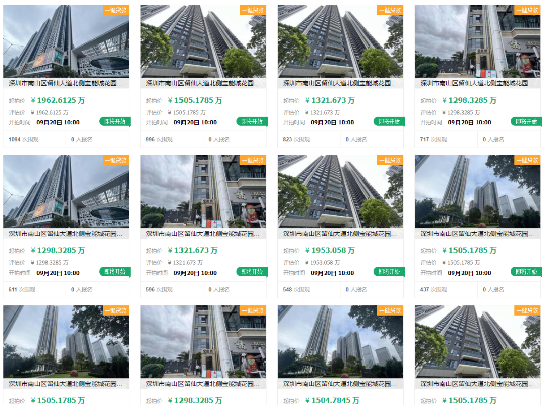 近日,阿里司法拍卖平台显示,深圳南山宝能城花园(简称“宝能城”)有40套房产被挂出来拍卖,将于9月20日、9月21日两天进行拍卖,单套房源起拍价为1298万~1962万元。