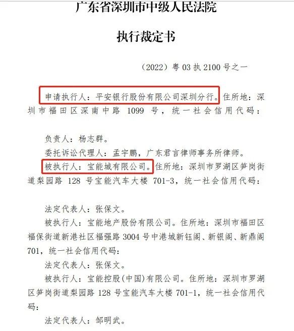 据阿里拍卖公布的《深圳市中级人民法院执行裁定书》,宝能城40套房拍卖的申请执行人为平安银行深圳分行,被执行人包括:宝能城有限公司、宝能地产股份有限公司、宝能控股(中国)有限公司和姚振华、深圳六金投资有限公司。