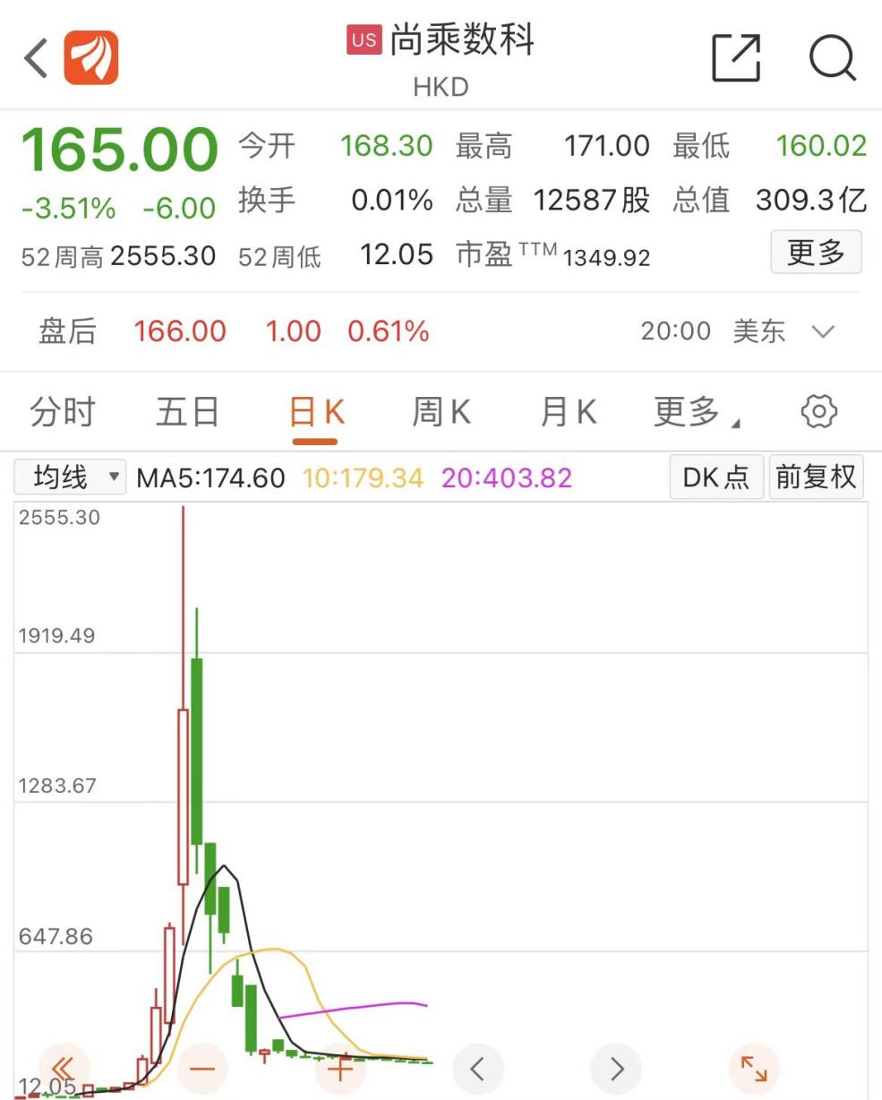尚乘数科一度被市场认为是“李嘉诚概念股”,而随着李嘉诚旗下长江实业发布新闻稿撇清与尚乘数科关系,称“长江集团旗下公司没有直接持有尚乘数科之股权,亦与该公司没有任何业务往来”,尚乘数科股价开始回落,截至最新收盘,已回落至165美元/股,相当于8月2日盘中股价最高日收盘价打了“一折”。