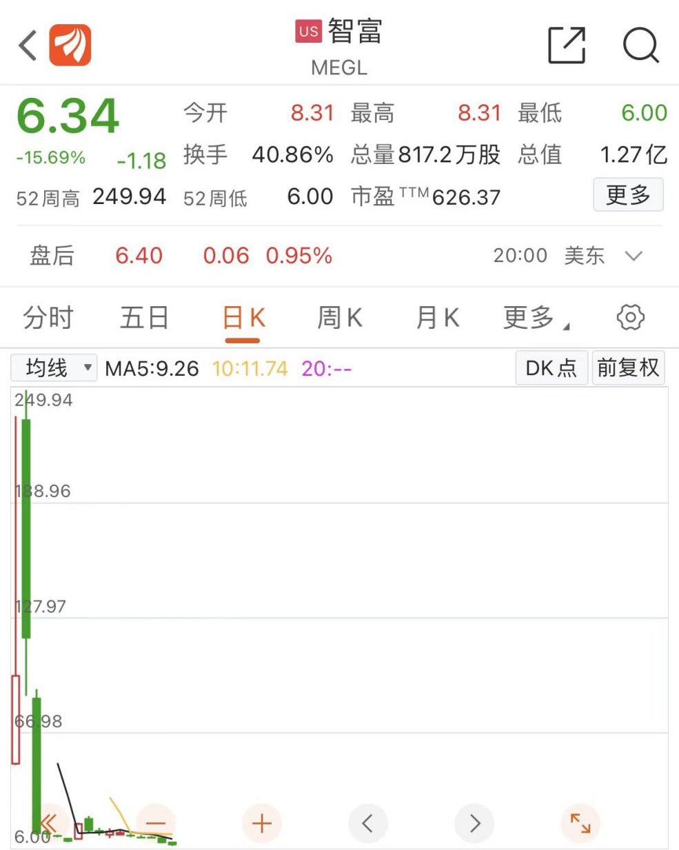 此外,8月5日在美上市的智富融资上市首日一度暴涨超52倍,其IPO发行价仅为4美元/股,当日内最高触及235.95美元/股,盘中多次触发熔断。据悉,智富融资是一家在中国香港的金融服务提供商,主要从事提供企业融资咨询服务和承销服务。公告显示,该公司仅有9名员工,该公司股价在8月8日最高一度冲至249.94美元/股,而截至最新收盘已回落至6.34美元/股,按两者价差计算,最高点买入者持仓市值蒸发约97%。