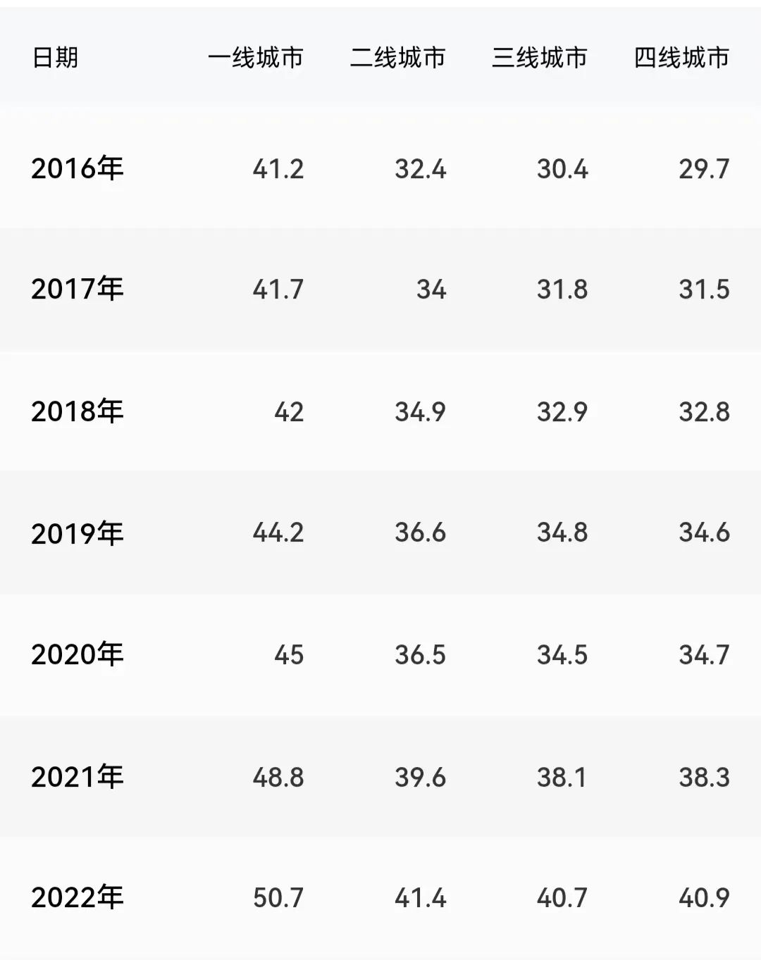 (1-4线城市近年电影票价走势)