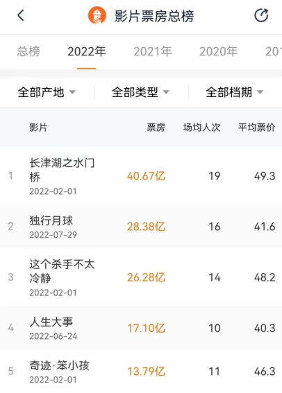 数据显示,2022年以来票房排名前十的电影,有8部平均票价超过40元,5部超过44元。尤其是票房冠军《长津湖之水门桥》平均票价接近50元。