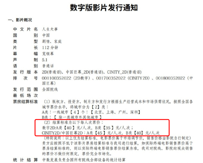 以6月份上映的电影《人生大事》为例,发行通知显示,版权方、投资方、制片方和发行方根据生产经营成本和市场供需状况,按照全国城市票价水平进行定价。