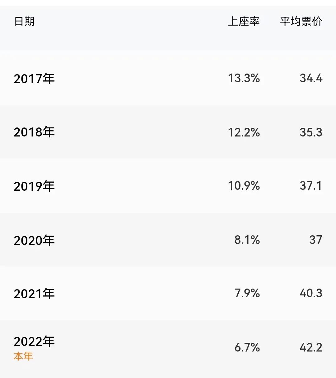 数据显示,2022年全年电影平均票价42.21元,较2021年的40.29元明显上涨;较疫情前的2019年,涨幅约14%。