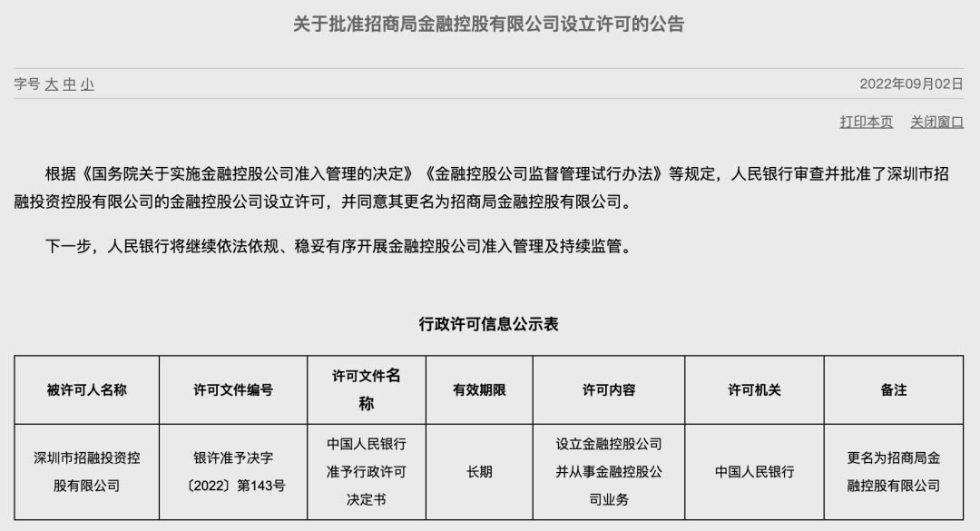 9月2日晚间,中国人民银行官网消息显示,招商局集团全资子公司招融投资获得金融控股公司设立许可,拟更名为“招商局金融控股有限公司”(下称“招商金控”)。