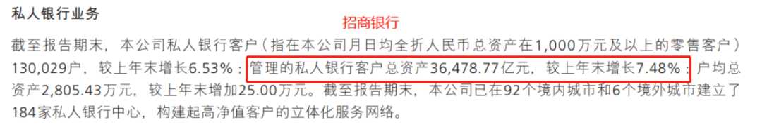 招行表示,截至报告期末,已在92个境内城市和6个境外城市建立了184家私人银行中心,构建起高净值客户的立体化服务网络。持续推进私人银行业务转型升级,强化“人家企社”(个人、家族、企业、社会需求)的综合化服务能力建设,构建起私人银行业务的核心竞争优势。