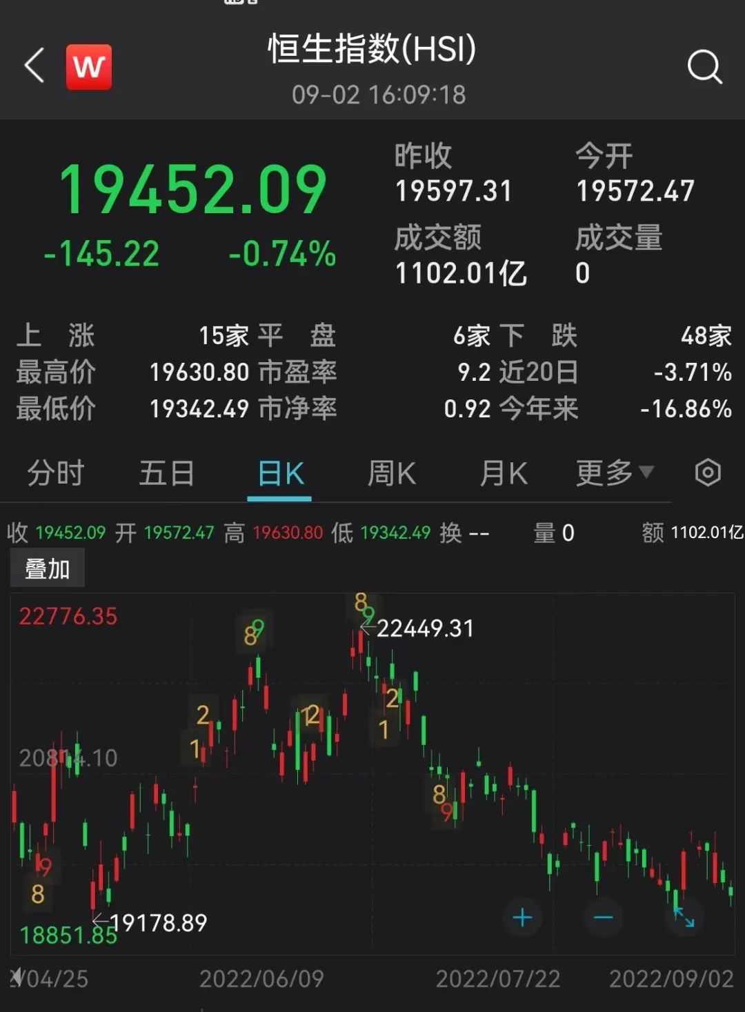 截至9月2日,恒生指数收于19452点,比6月底的高点22449点跌去近3000点,跌幅超13%。
