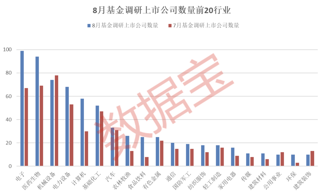 证券时报·数据宝统计,8月基金合计调研748家上市公司,较7月环比增加168家。分行业看,电子、医药生物板块最受欢迎,各有超过90家公司获得调研;机械设备、电力设备、计算机和基础化工板块获得调研公司数量均在50家以上。