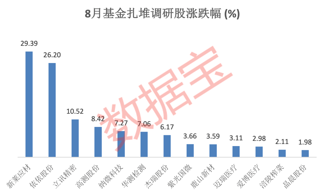 行情方面,上述27家公司股价走势分化,但整体仍跑赢沪指,8月平均跌幅0.58%,7股涨逾5%,新莱应材、依依股份大涨超20%,立讯精密涨超10%。