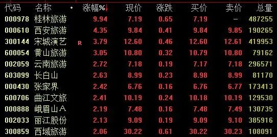 来看A股市场。随着中秋、国庆小长假临近,旅游、酒店餐饮、机场、航空等出行板块今日集体拉升,截至收盘,旅游板块方面,桂林旅游涨停,西安旅游、宋城演艺涨约4%,黄山旅游涨逾3%;酒店餐饮板块方面,同庆楼涨逾8%,君亭酒店涨近7%;航空、机场方面,白云机场、上海机场、春秋航空、中国国航等涨约3%。
