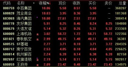 免税概念盘中走势活跃,截至收盘,中百集团、茂业商业、海汽集团涨停,友好集团、大连友谊涨超5%。