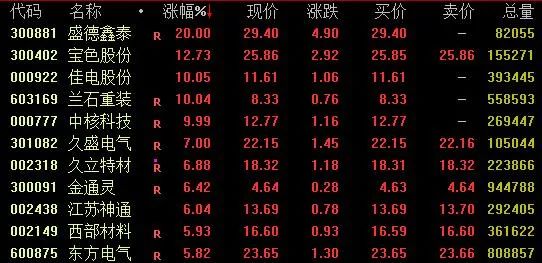 核电板块盘中走强,截至收盘,盛德鑫泰“20cm”涨停,宝色股份涨近13%,佳电股份、兰石重装、中核科技涨停,久盛电气、金通灵、江苏神通等涨超6%。