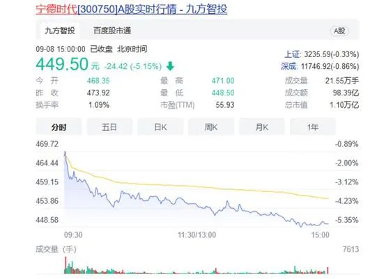 宁德时代(300750)盘中震荡下探,失守450元大关。截至收盘,该股跌5.15%报449.5元,全日成交98.4亿元。