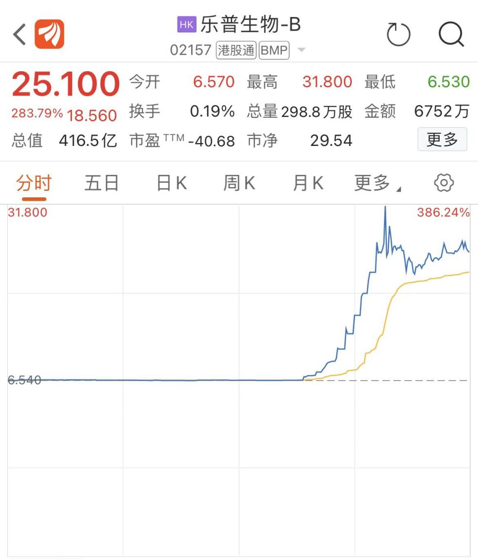 9月9日,港股乐普生物午后开始股价一路走高,仅一小时大涨近4倍,最大涨幅达386.24%。随后涨幅略有回落,截至收盘,乐普生物涨283.79%,报25.1港元/股,总市值为417亿港元。