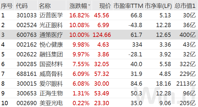 此外,A股多只医药股,尤其是医疗服务类个股纷纷走高。其中,通策医疗、光正眼科、悦心健康、融钰集团等涨停,迈普医学、国瓷材料、爱尔眼科、正海生物、美亚光电等领涨。