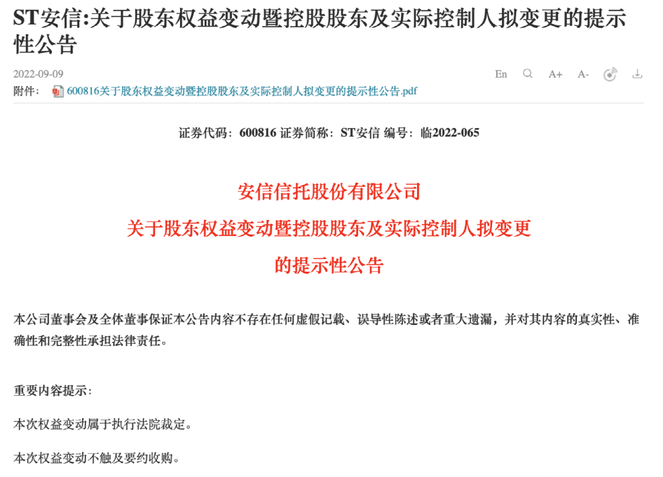 9月9日,安信信托发布发布关于股东权益变动暨控股股东及实际控制人拟变更的提示性公告。公告显示,中国信托业保障基金有限责任公司(下称“信保基金”)代中国信托业保障基金通过司法处置的方式获得公司控股股东上海国之杰持有的安信信托14.55万股股份,占安信信托总股本的26.60%。