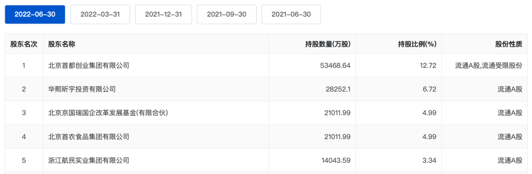 公开资料显示,因IPO原第一大股东华熙昕宇持续减持,原第二大股东首创集团在2019年底被动成为第一大股东,目前持股比例12.72%。