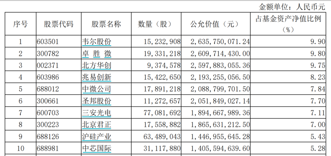 Wind数据显示,2022年6月30日,该基金重仓韦尔股份、卓胜微、北方华创、兆易创新、中微公司、圣邦股份等芯片股,持仓市值均超过20亿元,其中卓胜微占基金净值比为9.8%,是仅次于韦尔股份的第二大重仓股。
