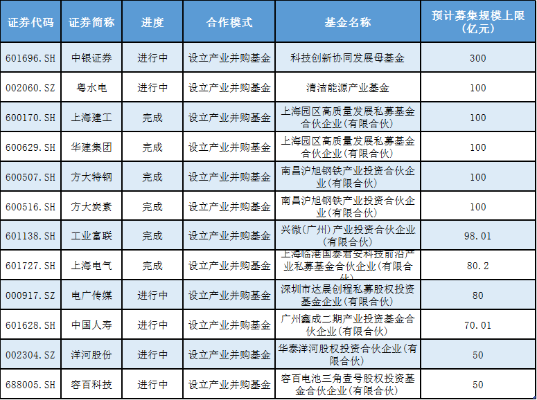 具体来看,中银证券、方大炭素、方大特钢、华建集团、上海建工、粤水电等上市公司参设的产业并购基金规模最大,均不低于100亿元。其中,中银证券参设的产业并购基金预计募资金额达300亿元,为最高者。