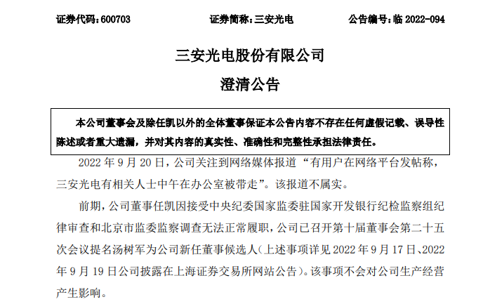 本次澄清公告中,三安光电再次披露了上述董事变更事项,并表示公司实际控制人、现任董事、监事、高管等管理人员均正常履职,公司生产经营一切正常。