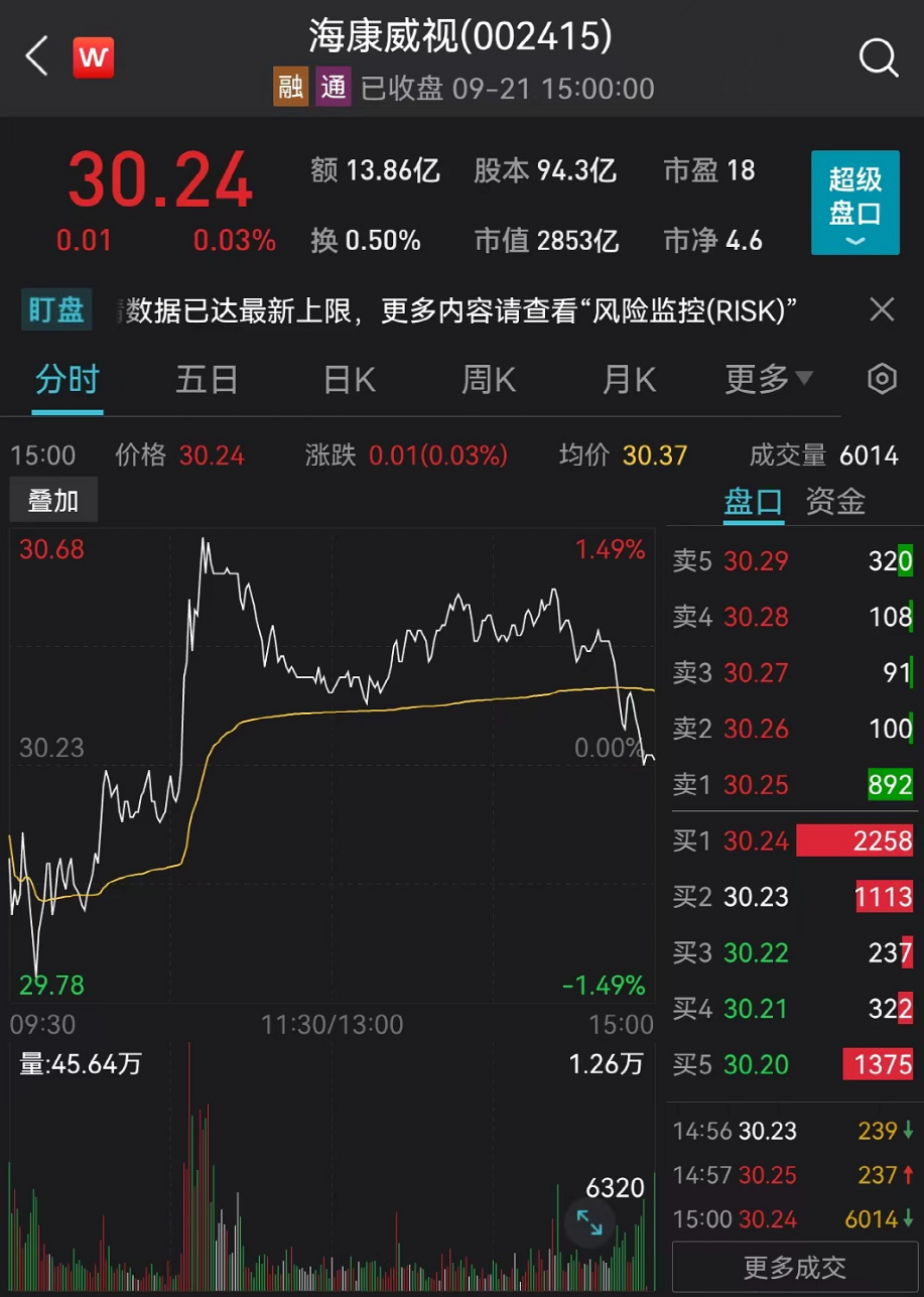 尽管今年海康威视股价跌幅超过40%,但近期反弹明显。周三海康威视股价早盘一度大幅拉升,涨幅将近1.5%,截止收盘微涨0.03%,报30.24元/股,最新总市值达到2853亿元。