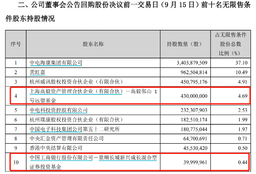 9月19日晚间,“安防龙头”海康威视发布了《关于回购股份事项前十名股东和前十名无限售条件股东持股信息的公告》。