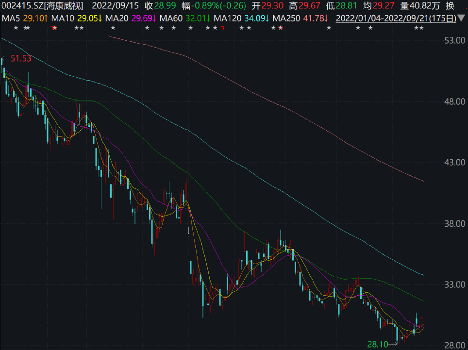 从股价表现来看,海康威视今年跌幅非常大,从年初的51.53元/股附近一路震荡下跌,截止9月21日收盘报30.24元/股,今年以来已经暴跌将近41%。尤其是在今年5月初,海康威视连续几个交易日暴跌,到5月13日曾跌至30.26元/股的位置。三季度,海康威视的股价持续调整,8月末跌破了30元/股,9月初一度跌至28.10元/股的低位,近两周有所反弹,最新股价超过了30元/股,总市值为2853亿元。