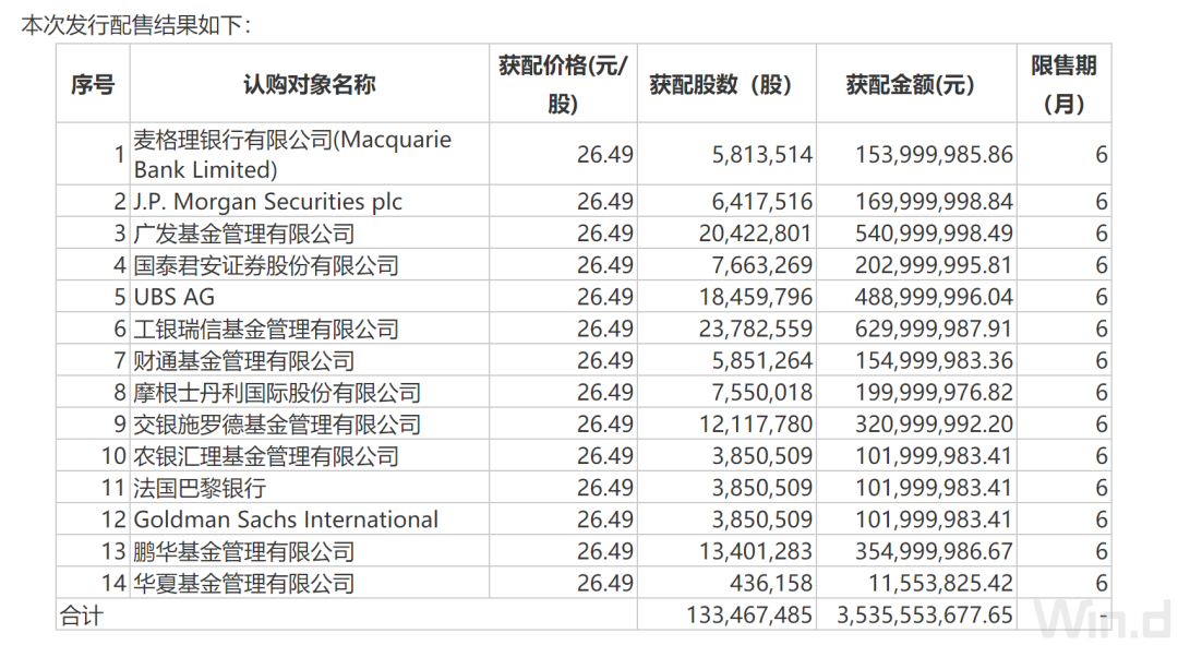 公告显示,此次定增的发行对象最终确定为14家,其中既有广发基金、工银瑞信基金、交银施罗德基金、华夏基金等头部公募,也有麦格理银行、J.P. Morgan、UBS AG、摩根士丹利等外资巨头,可谓是明星云集。