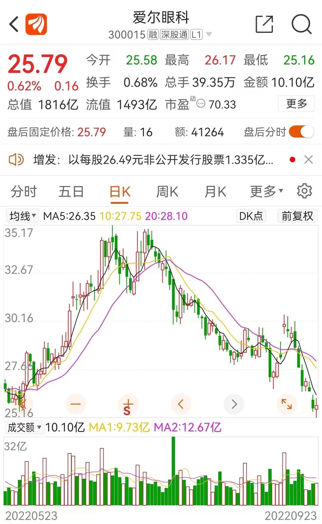 值得注意的是,由于近期股价持续回调,截至9月23日收盘,爱尔眼科报收25.79元/股,已经低于26.49元/股的定增价,这意味着此次定增的参与方已经出现了“浮亏”。