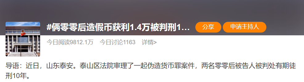 25日早间,#俩零零后造假币获利1.4万被判刑10年#的话题冲上热搜。