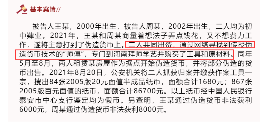 2021年,王某和周某商量着想法子弄点钱花,又不想费力工作,遂将主意打到了伪造货币上。二人共同出资,通过网络寻找到传授伪造货币技术的“师傅”,专门到河南拜师学艺并购买了工具和原材料。