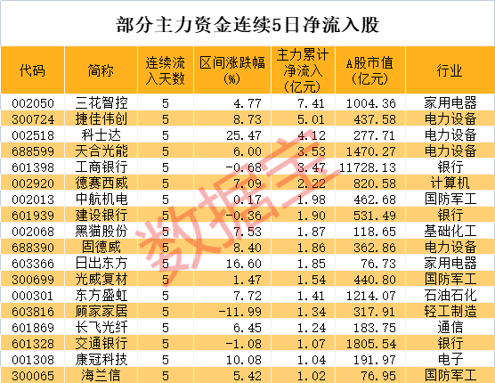 近几日A股整体持续低迷,但部分股票获主力资金持续流入。证券时报·数据宝统计,不含近一个月上市的次新股,18股近5个交易日持续获得主力资金净流入且累计净流入额超亿元。工商银行、交通银行、天合光能、东方盛虹、三花智控等5只千亿市值的权重股入围,三花智控累计净流入额7.41亿元居首。