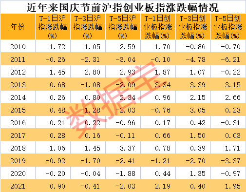 数据宝统计,2000年以来,国庆节前5个交易日上证指数累计上涨的次数为9次,上涨概率为40.9%;节前3个交易日累计上涨的概率为50%,节前1个交易日累计上涨的概率为68.2%。创业板指节前5个交易日累计上涨的概率为50%,节前3个交易日累计上涨的概率为75%,节前1个交易日累计上涨的概率也为75%。