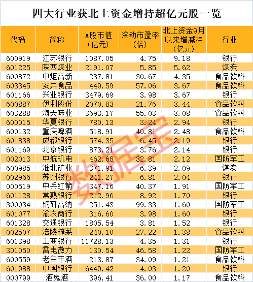 上述四大行业中,哪些股票近期获得北上资金提前埋伏?数据宝统计,9月以来,按照成交均价计算,北上资金增持超亿元的有25只。从估值水平来看,截至9月26日收盘,这些股票中超半数滚动市盈率低于10倍,华夏银行市盈率3.24倍排在最低位置。